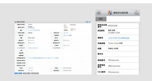 スキャンした名刺情報や入力した顧客情報に、グループウェアで登録したスケジュールやToDo、ファイルを紐付けて管理することができます。顧客情報や商談履歴はスマホでも確認することができますので、外出先でも素早い対応が可能となります。